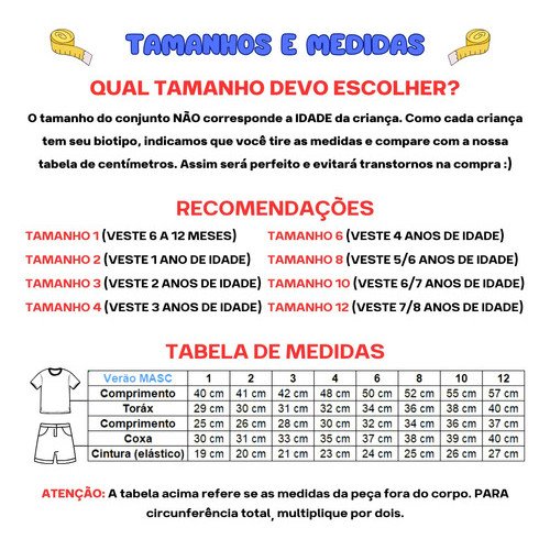Como cada criança tem seu biotipo, indicamos pegar uma roupa que fique confortável na criança, tirar a medida e comparar com a nossa tabela de centímetros. Assim será perfeito e evitará transtornos na compra 🙂